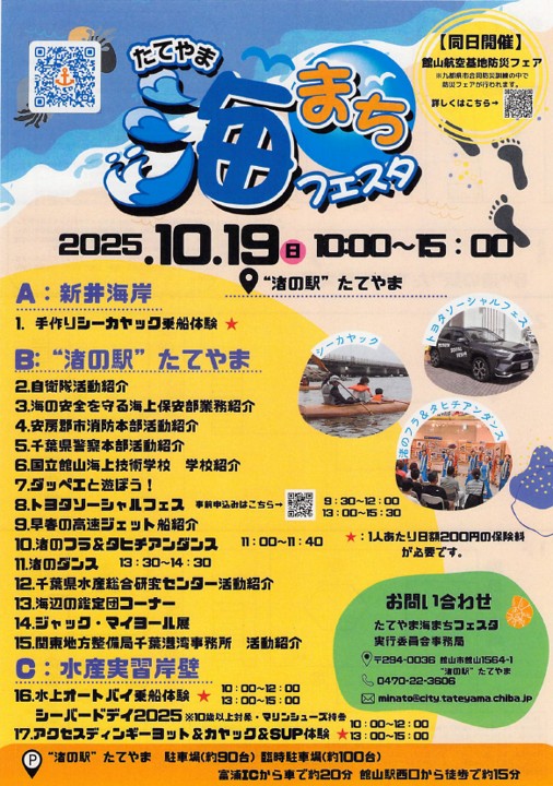 2025年10月03日 シーバード館山 10月19日シーバードデイ開催 シーバード館山お知らせ 10月19日(日)、千葉県・館山の海の駅を中心に「たてやま海のまちフェスタ」を実施します。シーバードデイとして水上オートバイの体験乗船をはじめ、参加型プログラムが盛りだくさん。ぜひお越しください。シーバード館山 辰野